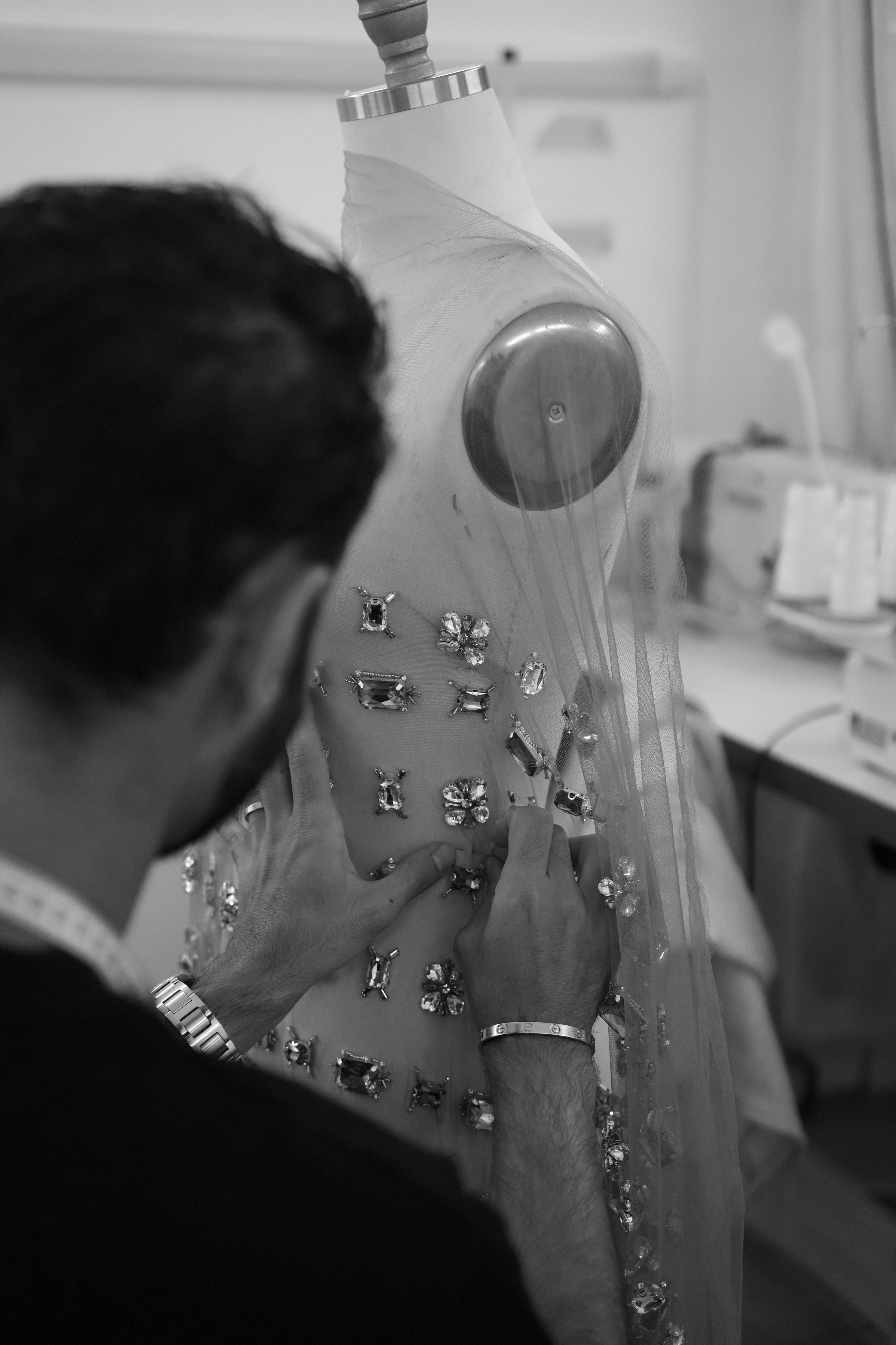 Each bespoke gown is meticulously handmade in our atelier, using couture techniques, intricate embroidery, and exquisite detailing. Brides who choose our bespoke service benefit from the exclusive involvement of Dylan Parienty himself during the creative process, guiding them through the selection of luxurious fabrics and personally validating each sketch to ensure a truly exceptional creation.