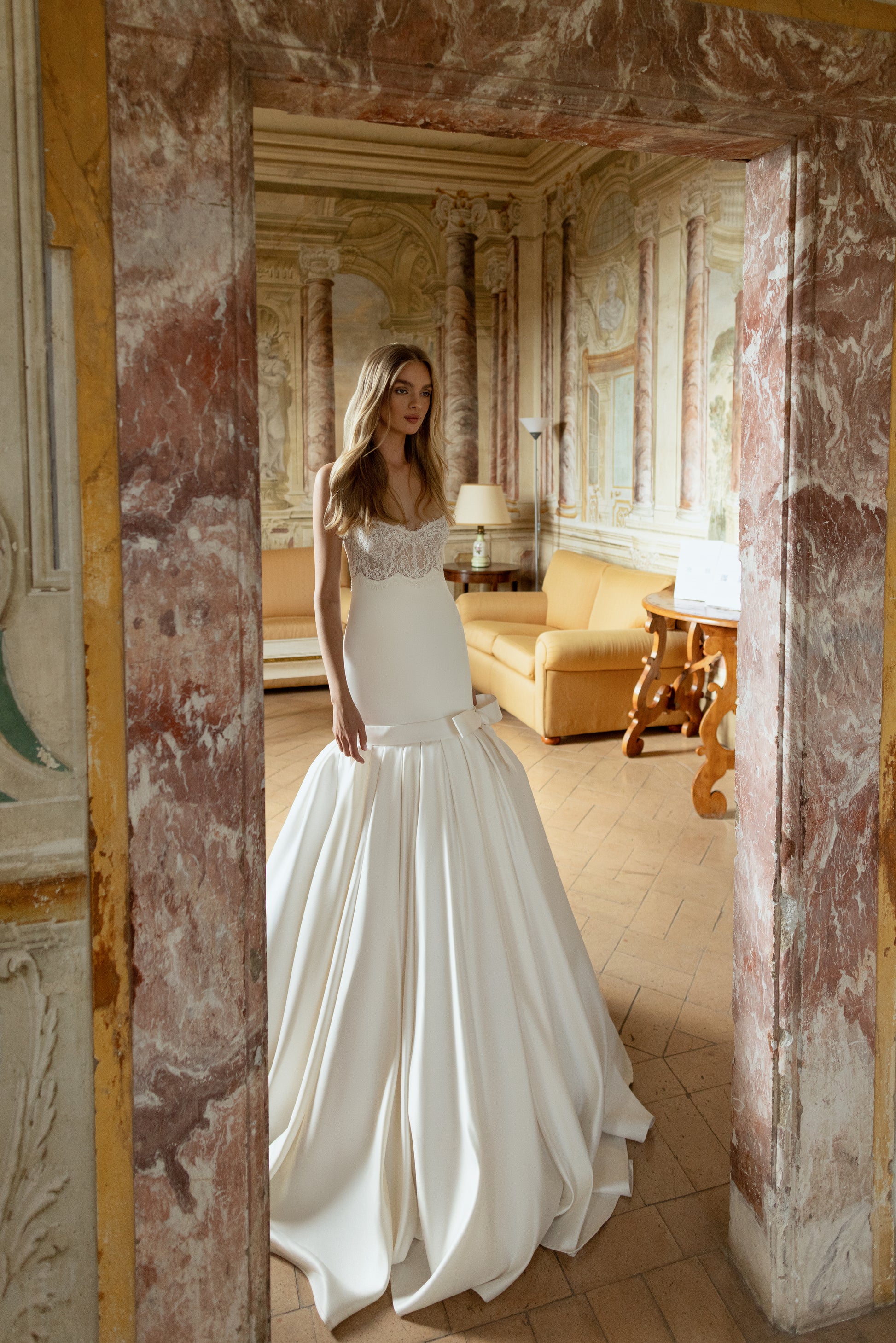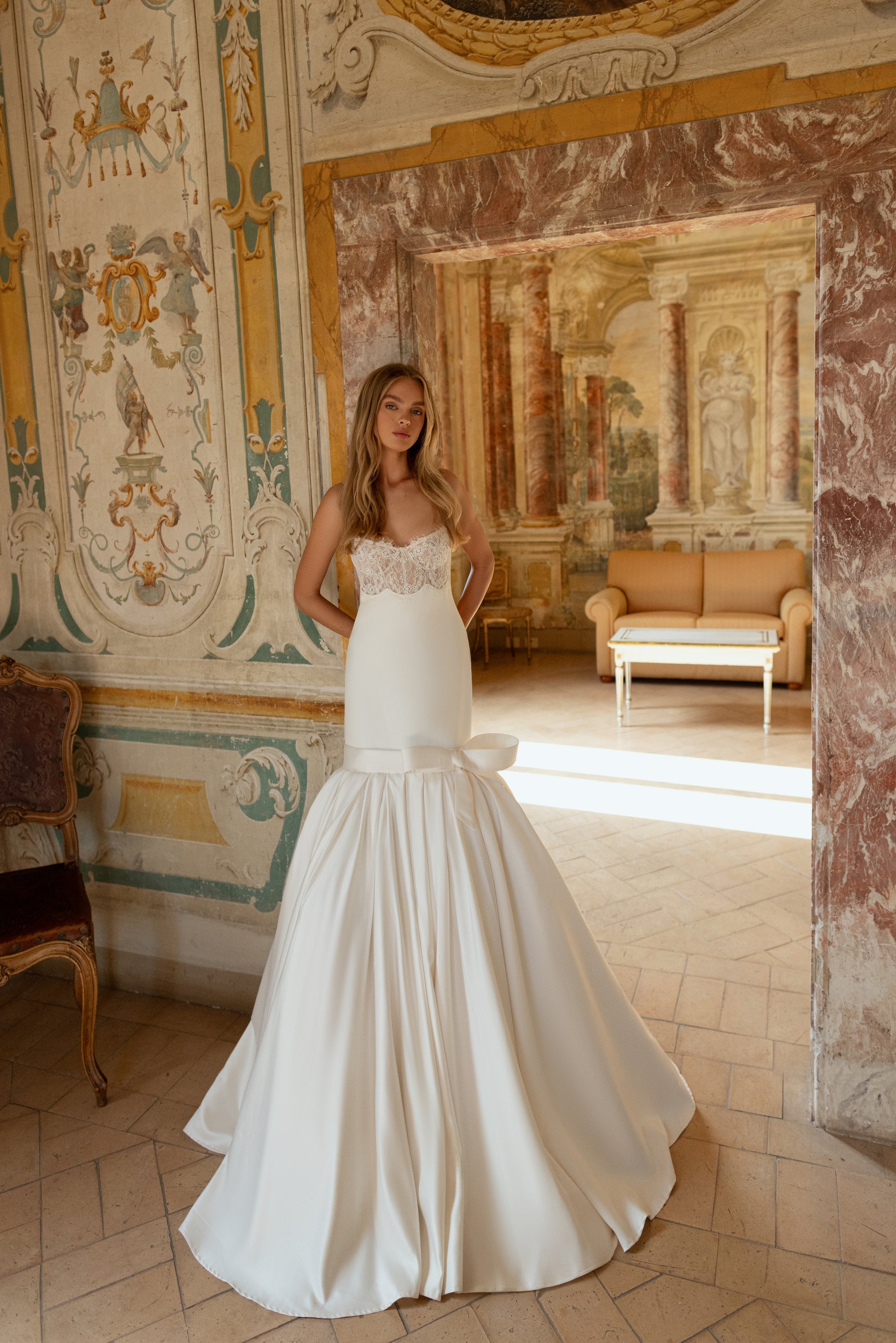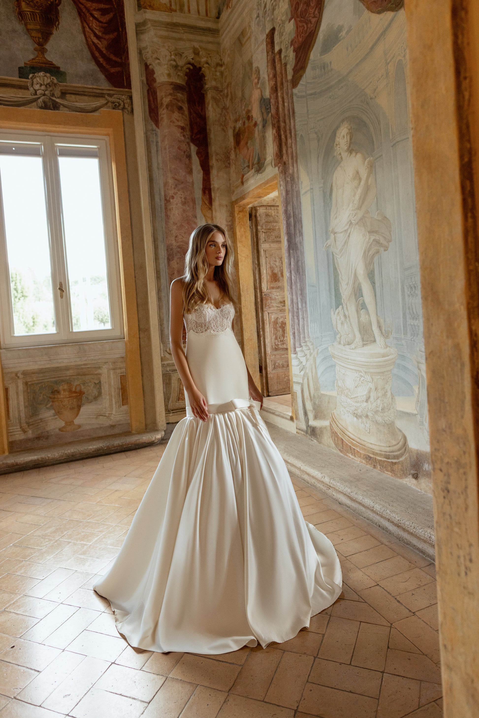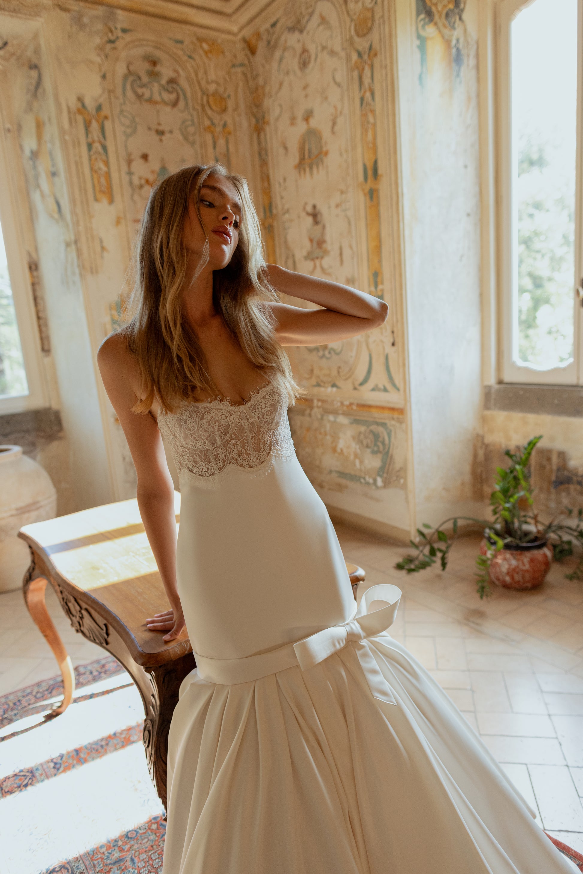 Lace corset bodice with soft sweetheart neckline, fitted through the hips and finished with a dropped waist flowing into a structured flared skirt in smooth satin.