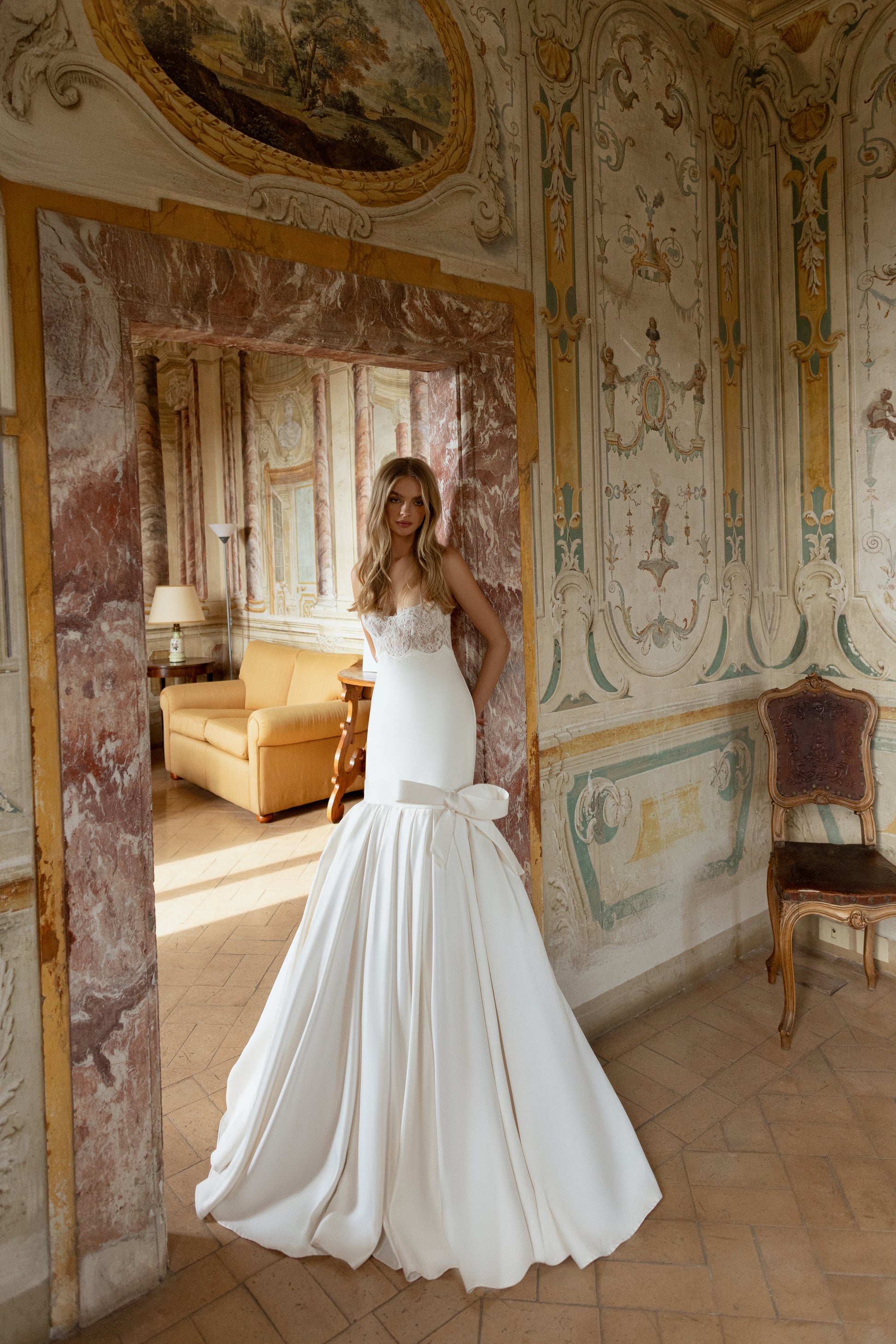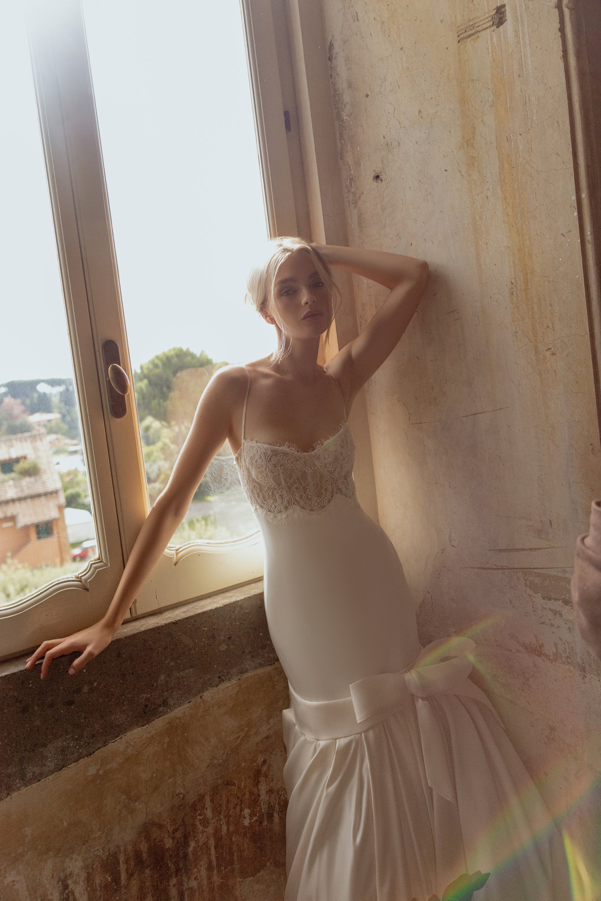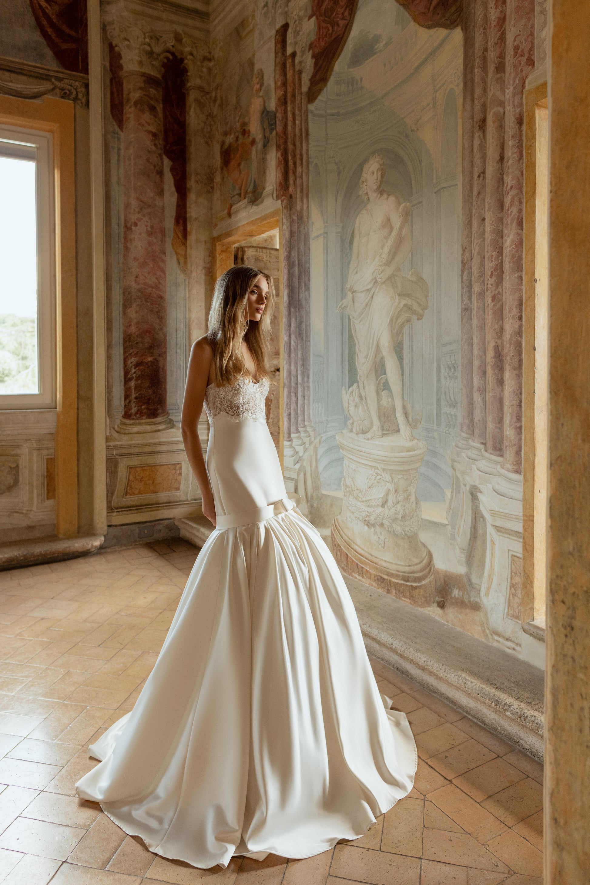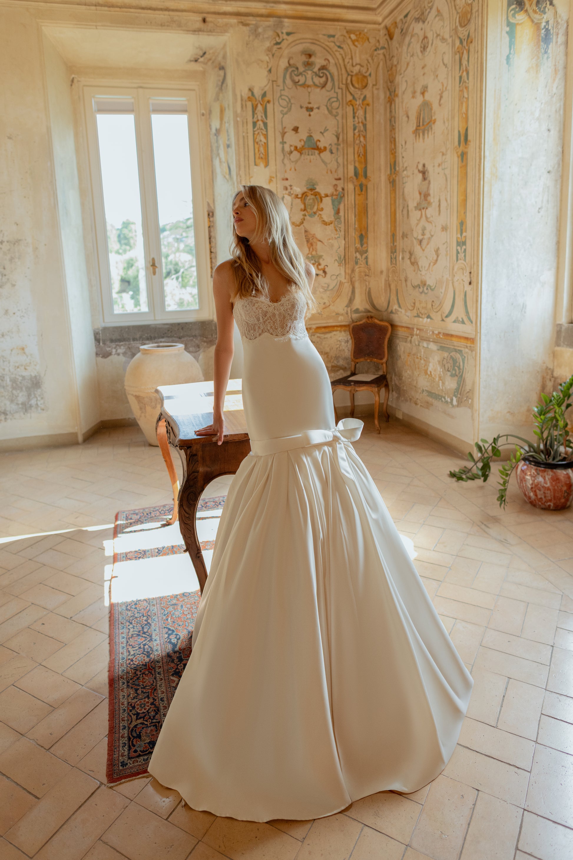 Lace corset bodice with soft sweetheart neckline, fitted through the hips and finished with a dropped waist flowing into a structured flared skirt in smooth satin.